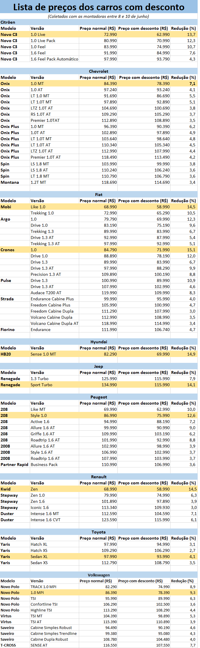 As linhas marcadas em amarelo na tabela correspondem aos maiores descontos de cada montadora.